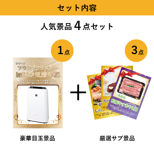 「シャープ加湿空気清浄機」をメイン景品とした、メイン景品1点とサブ景品3点を合わせたセット!