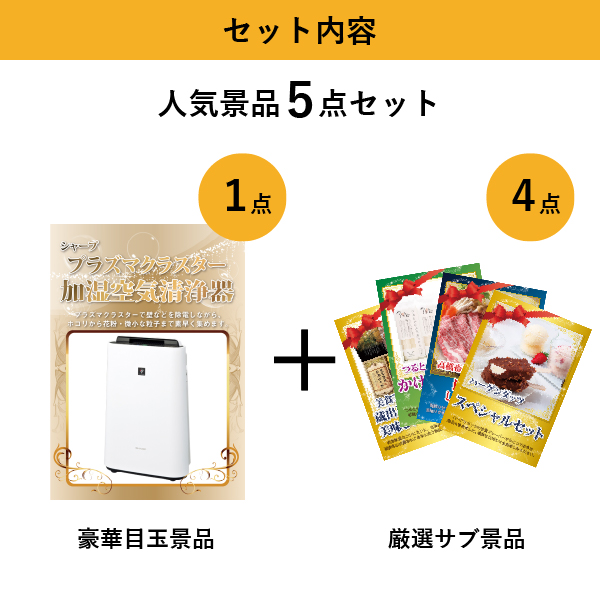 「シャープ加湿空気清浄機」をメイン景品とした、メイン景品1点とサブ景品4点を合わせたセット!