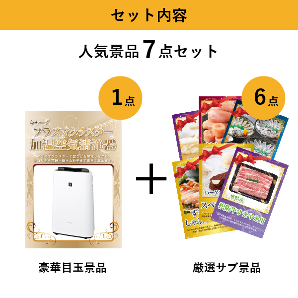 「シャープ加湿空気清浄機」をメイン景品とした、メイン景品1点とサブ景品6点を合わせたセット!