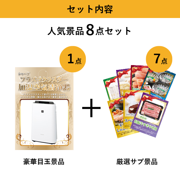 「シャープ加湿空気清浄機」をメイン景品とした、メイン景品1点とサブ景品7点を合わせたセット!