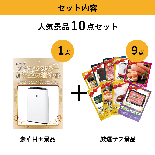 「シャープ加湿空気清浄機」をメイン景品とした、メイン景品1点とサブ景品9点を合わせたセット!