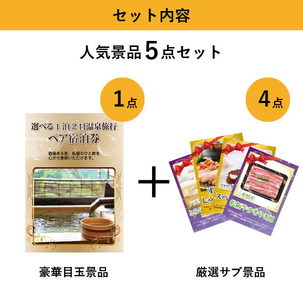 「選べる温泉旅行ペア宿泊券」をメイン景品とした、メイン景品1点とサブ景品4点を合わせたセット!