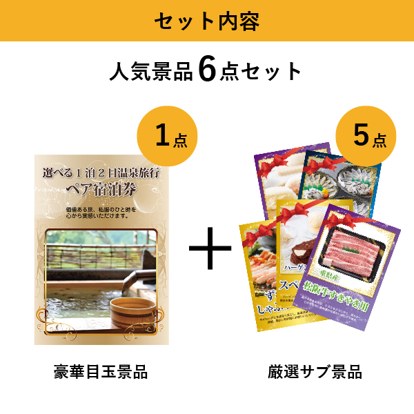 「選べる温泉旅行ペア宿泊券」が目玉の人気景品6点セットA|景品ならPIARY(ピアリー)