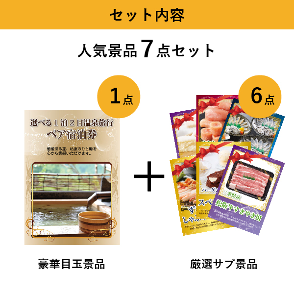 「選べる温泉旅行ペア宿泊券」をメイン景品とした、メイン景品1点とサブ景品6点を合わせたセット!
