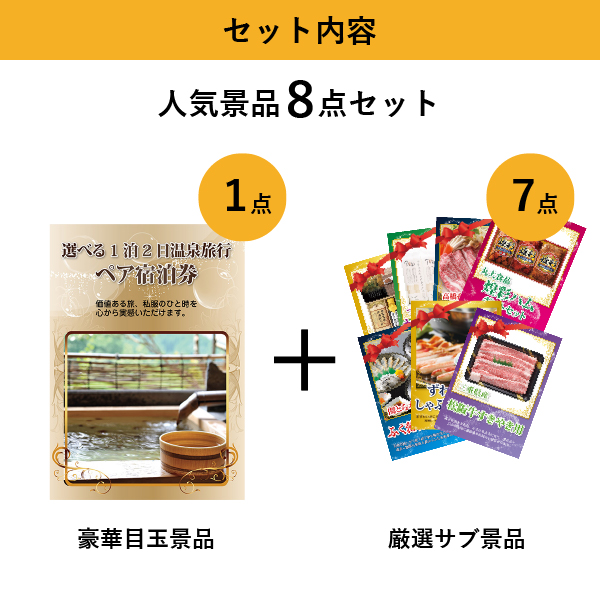 「選べる温泉旅行ペア宿泊券」をメイン景品とした、メイン景品1点とサブ景品7点を合わせたセット!