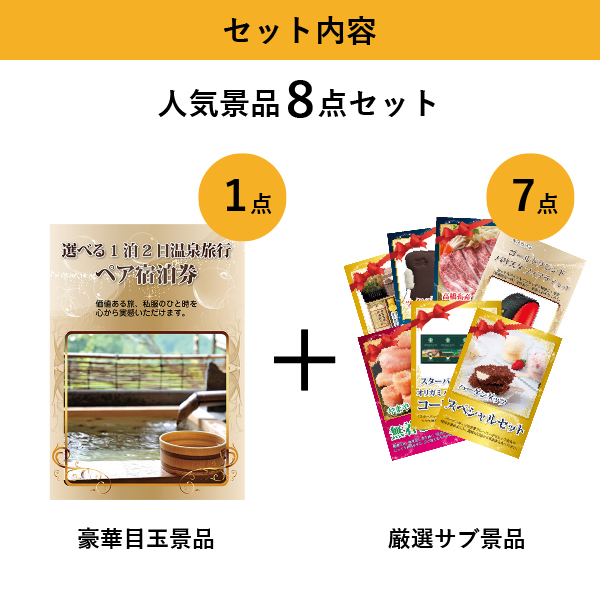 「選べる温泉旅行ペア宿泊券」をメイン景品とした、メイン景品1点とサブ景品7点を合わせたセット!