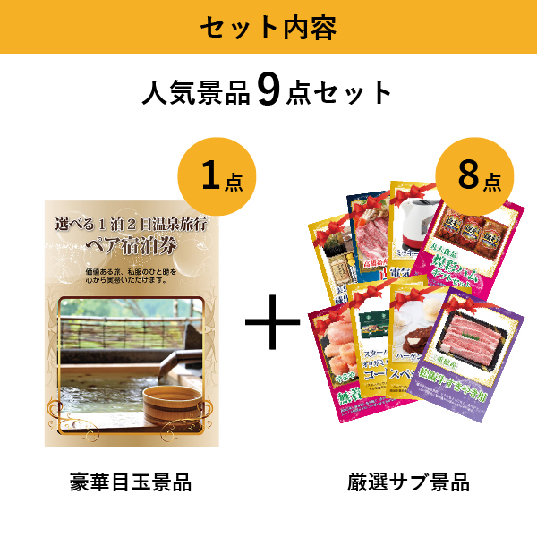 「選べる温泉旅行ペア宿泊券」をメイン景品とした、メイン景品1点とサブ景品8点を合わせたセット!
