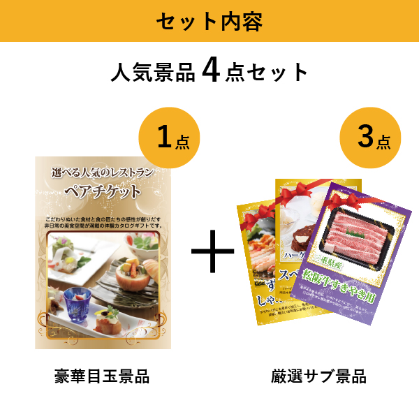 「選べる人気の高級レストランペアチケット」をメイン景品とした、メイン景品1点とサブ景品3点を合わせたセット!
