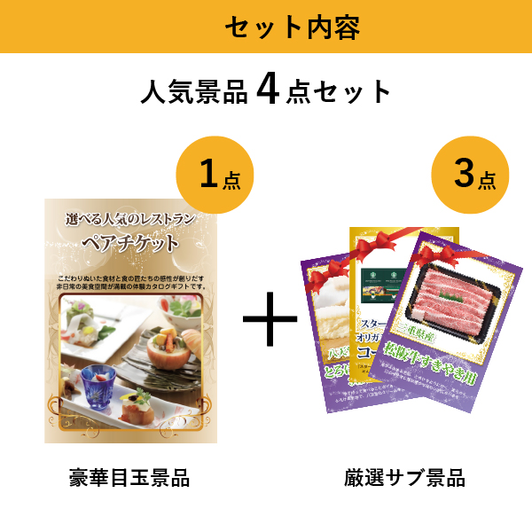 「選べる人気の高級レストランペアチケット」をメイン景品とした、メイン景品1点とサブ景品3点を合わせたセット!