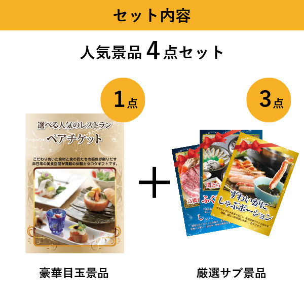 「選べる人気の高級レストランペアチケット」をメイン景品とした、メイン景品1点とサブ景品3点を合わせたセット!