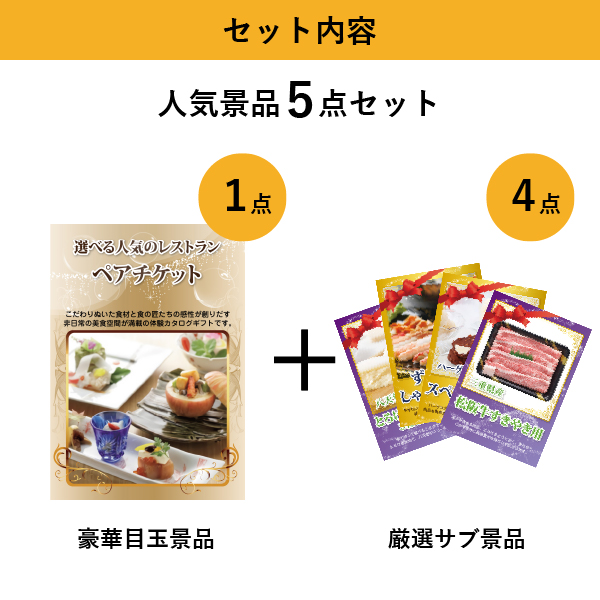 「選べる人気の高級レストランペアチケット」をメイン景品とした、メイン景品1点とサブ景品4点を合わせたセット!