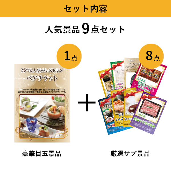 「選べる人気の高級レストランペアチケット」をメイン景品とした、メイン景品1点とサブ景品8点を合わせたセット!