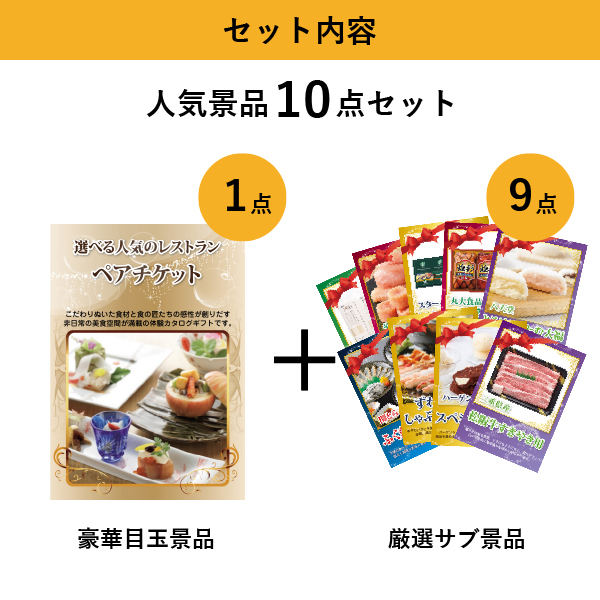 「選べる人気の高級レストランペアチケット」をメイン景品とした、メイン景品1点とサブ景品9点を合わせたセット!