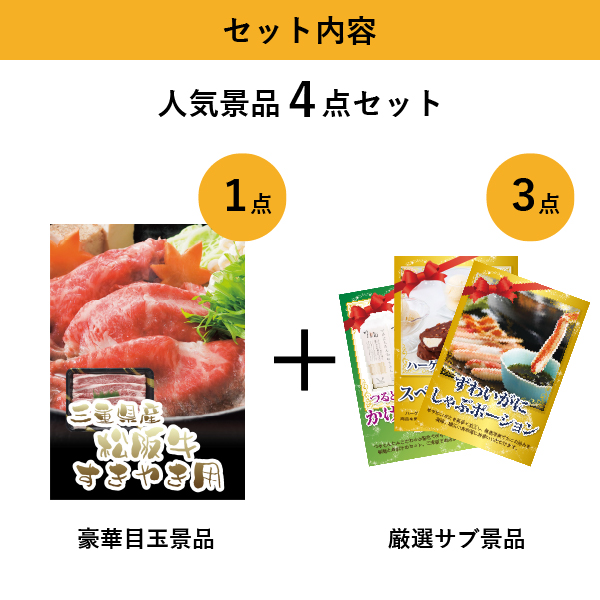 「三重県産 松阪牛すきやき用」をメイン景品とした、メイン景品1点とサブ景品3点を合わせたセット!