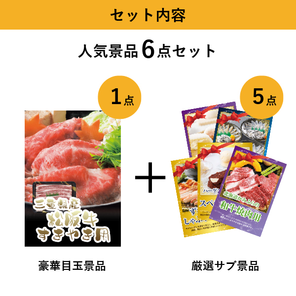 「三重県産 松阪牛すきやき用」をメイン景品とした、メイン景品1点とサブ景品5点を合わせたセット!