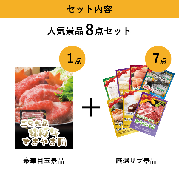 「三重県産 松阪牛すきやき用」をメイン景品とした、メイン景品1点とサブ景品7点を合わせたセット!