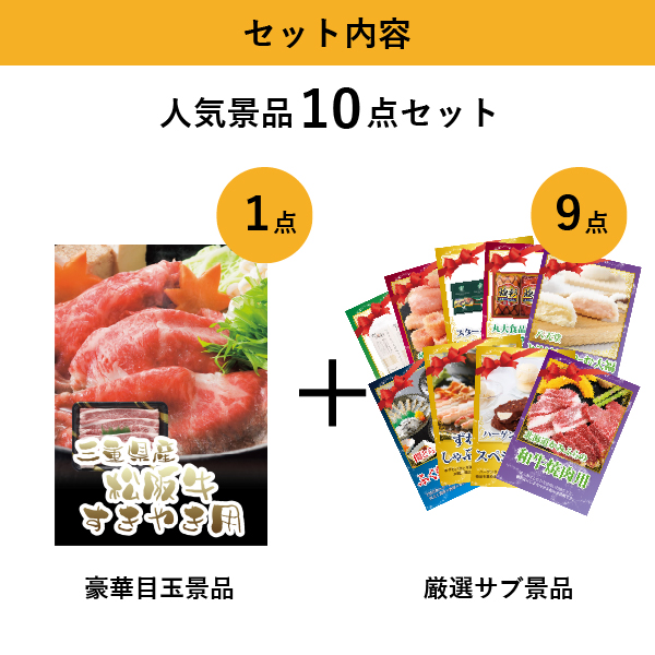 「三重県産 松阪牛すきやき用」をメイン景品とした、メイン景品1点とサブ景品9点を合わせたセット!