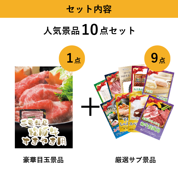「三重県産 松阪牛すきやき用」をメイン景品とした、メイン景品1点とサブ景品9点を合わせたセット!
