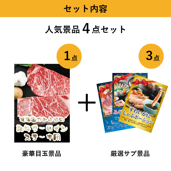 「北海道かみふらの和牛サーロインステーキ」をメイン景品とした、メイン景品1点とサブ景品3点を合わせたセット!