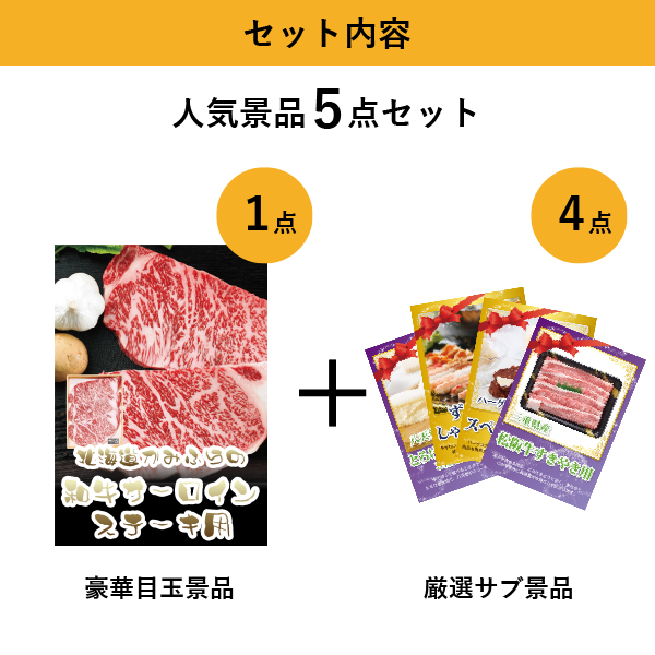 「北海道かみふらの和牛サーロインステーキ」をメイン景品とした、メイン景品1点とサブ景品4点を合わせたセット!