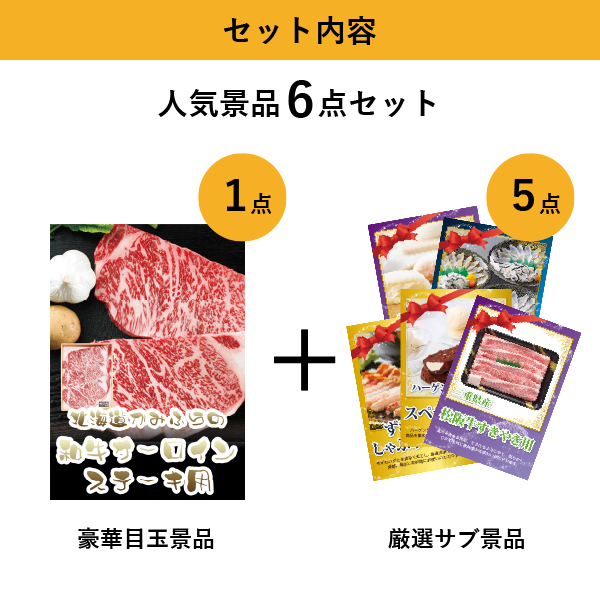 「北海道かみふらの和牛サーロインステーキ」をメイン景品とした、メイン景品1点とサブ景品5点を合わせたセット!