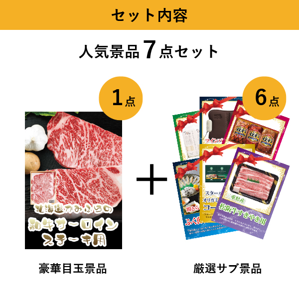「北海道かみふらの和牛サーロインステーキ」をメイン景品とした、メイン景品1点とサブ景品6点を合わせたセット!