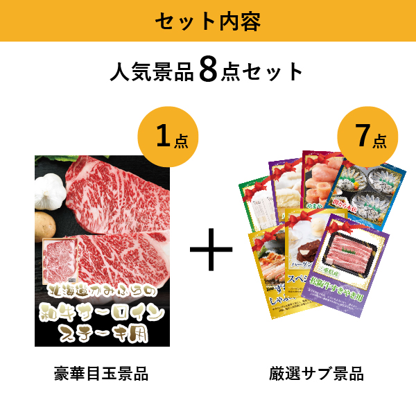 「北海道かみふらの和牛サーロインステーキ」が目玉の人気景品8点セットA| 結婚式 二次会 忘年会におすすめ!|景品ならPIARY(ピアリー)