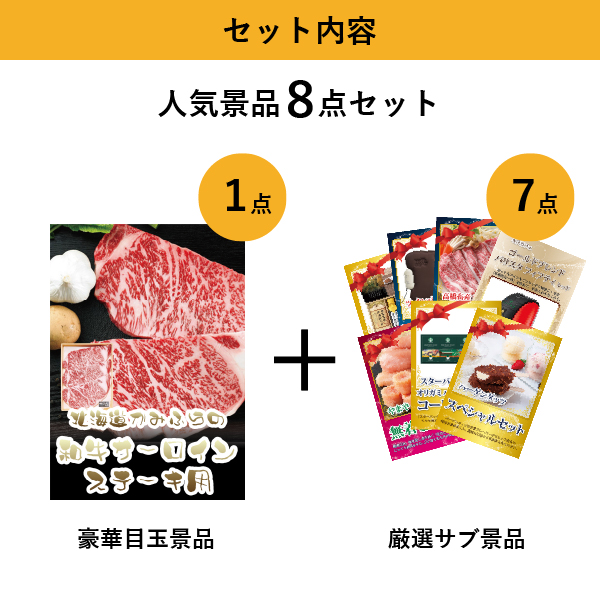 「北海道かみふらの和牛サーロインステーキ」をメイン景品とした、メイン景品1点とサブ景品7点を合わせたセット!