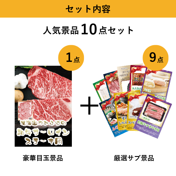 「北海道かみふらの和牛サーロインステーキ」をメイン景品とした、メイン景品1点とサブ景品9点を合わせたセット!