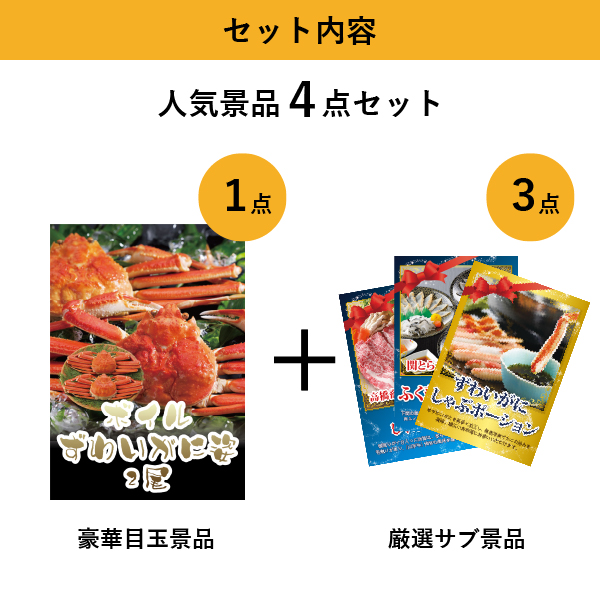 「ボイルずわいがに姿2尾」をメイン景品とした、メイン景品1点とサブ景品3点を合わせたセット!