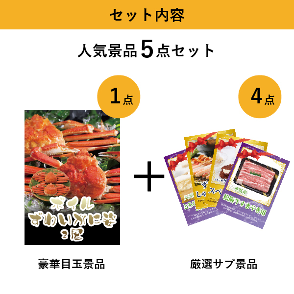 「ボイルずわいがに姿2尾」をメイン景品とした、メイン景品1点とサブ景品4点を合わせたセット!