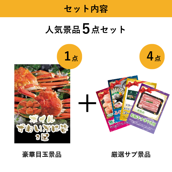 「ボイルずわいがに姿2尾」をメイン景品とした、メイン景品1点とサブ景品4点を合わせたセット!