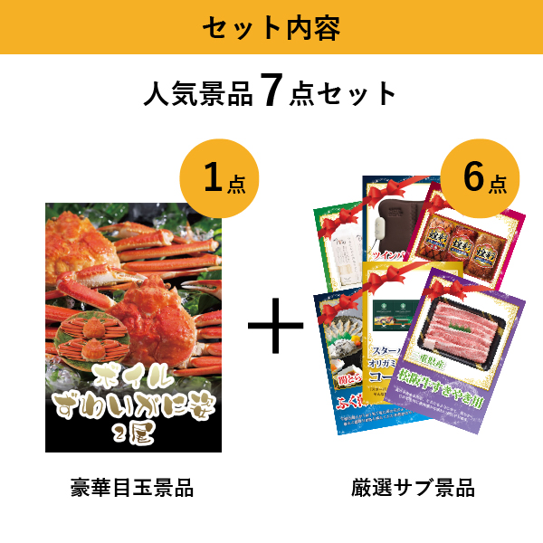 「ボイルずわいがに姿2尾」をメイン景品とした、メイン景品1点とサブ景品6点を合わせたセット!