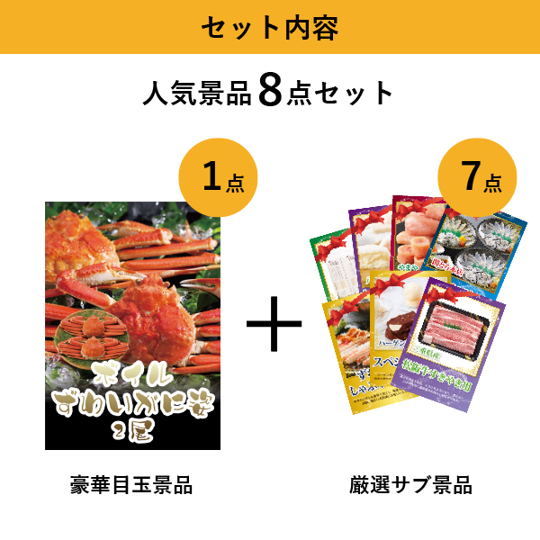 「ボイルずわいがに姿2尾」をメイン景品とした、メイン景品1点とサブ景品7点を合わせたセット!