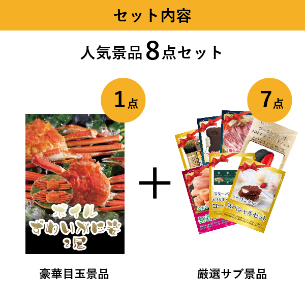 「ボイルずわいがに姿2尾」をメイン景品とした、メイン景品1点とサブ景品7点を合わせたセット!