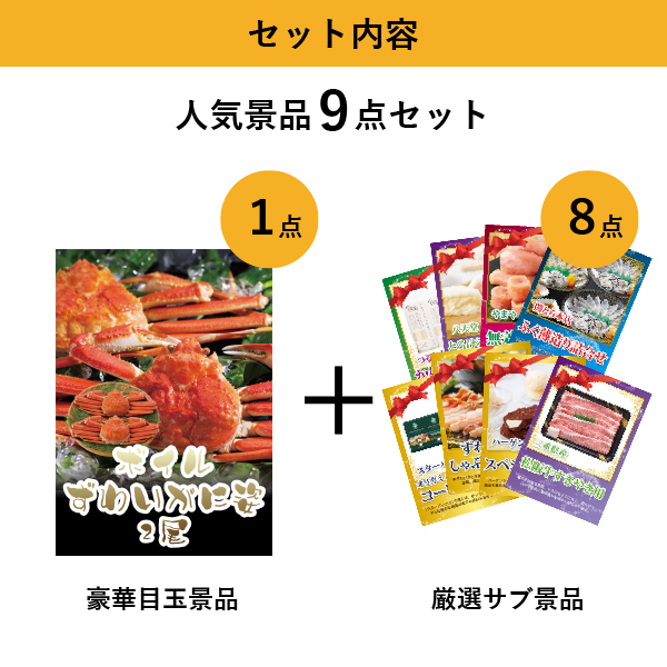 「ボイルずわいがに姿2尾」をメイン景品とした、メイン景品1点とサブ景品8点を合わせたセット!