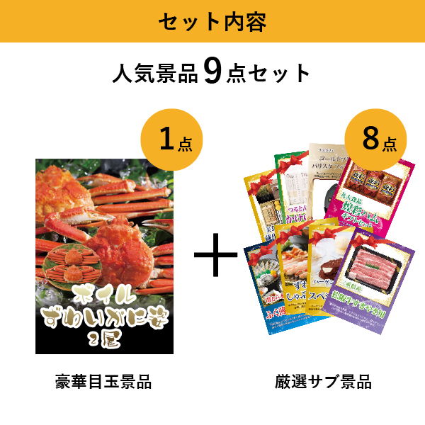 「ボイルずわいがに姿2尾」をメイン景品とした、メイン景品1点とサブ景品8点を合わせたセット!