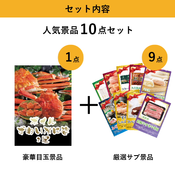 「ボイルずわいがに姿2尾」をメイン景品とした、メイン景品1点とサブ景品9点を合わせたセット!