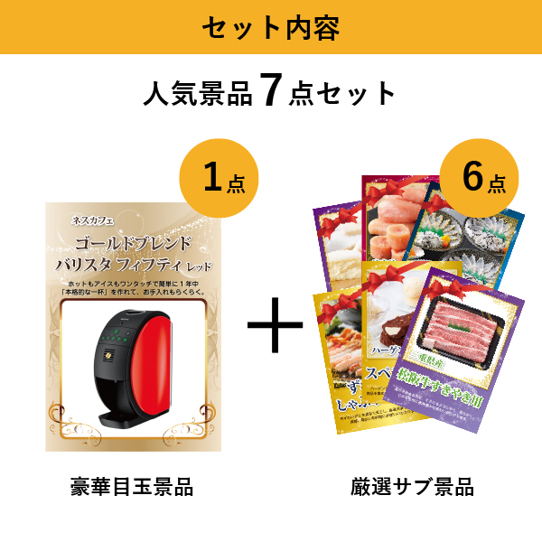 「ネスカフェ ゴールドブレンド バリスタ フィフティ レッド」が目玉の人気景品7点セットA| 結婚式 二次会 忘年会におすすめ!|景品ならPIARY(ピアリー)