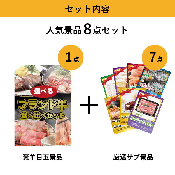 「選べるブランド牛 食べ比べセット」をメイン景品とした、メイン景品1点とサブ景品7点を合わせたセット!