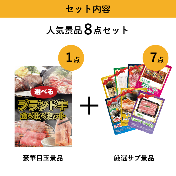 「選べるブランド牛 食べ比べセット」をメイン景品とした、メイン景品1点とサブ景品7点を合わせたセット!