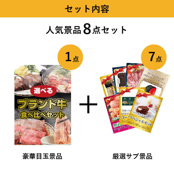 「選べるブランド牛 食べ比べセット」をメイン景品とした、メイン景品1点とサブ景品7点を合わせたセット!