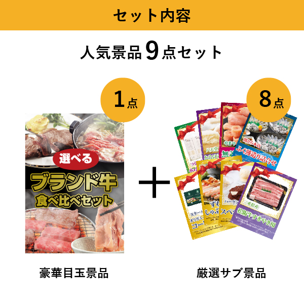 「選べるブランド牛 食べ比べセット」をメイン景品とした、メイン景品1点とサブ景品8点を合わせたセット!