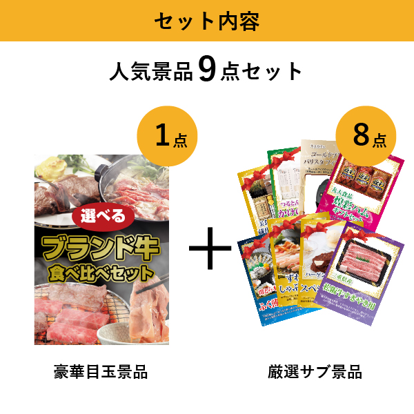 「選べるブランド牛 食べ比べセット」をメイン景品とした、メイン景品1点とサブ景品8点を合わせたセット!