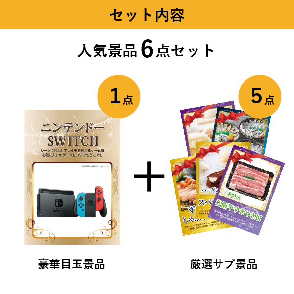 「ニンテンドーSWITCH」をメイン景品とした、メイン景品1点とサブ景品5点を合わせたセット!