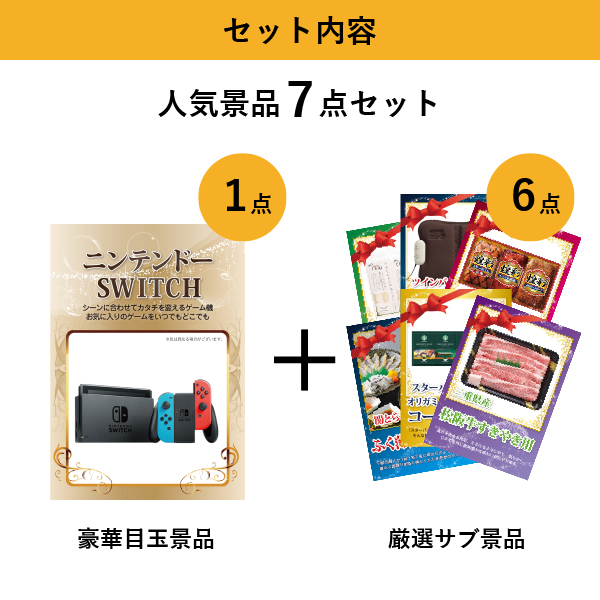 「ニンテンドーSWITCH」をメイン景品とした、メイン景品1点とサブ景品6点を合わせたセット!