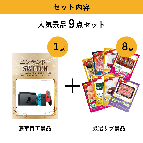 「ニンテンドーSWITCH」をメイン景品とした、メイン景品1点とサブ景品8点を合わせたセット!