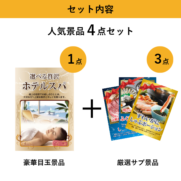「選べる贅沢ホテルスパ」をメイン景品とした、メイン景品1点とサブ景品3点を合わせたセット!