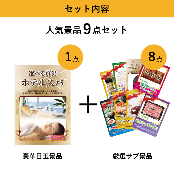 「選べる贅沢ホテルスパ」をメイン景品とした、メイン景品1点とサブ景品8点を合わせたセット!
