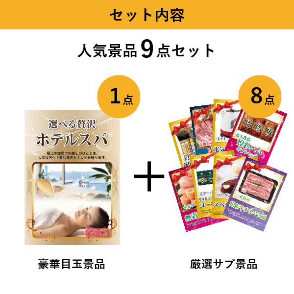 「選べる贅沢ホテルスパ」をメイン景品とした、メイン景品1点とサブ景品8点を合わせたセット!
